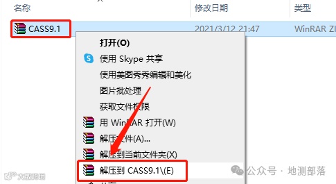 1.下载软件安装包,鼠标右击【CASS9.1】,选择【解压到CASS9.1】。
