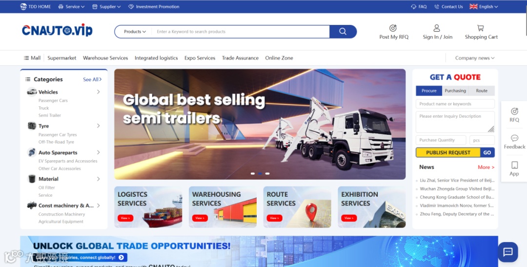 CNAUTO是国联股份旗下的垂直汽车装备/工程机械产业带跨境平台,定位于“提供一站式产业带跨境出海综合服务”,以数字化综合服务平台为载体,构建“公服平台、交易结算、仓网联动、柔性制造、供应链交付、研发品控、产融科技”为核心业务的汽车装备/工程机械产业带跨境交易生态。