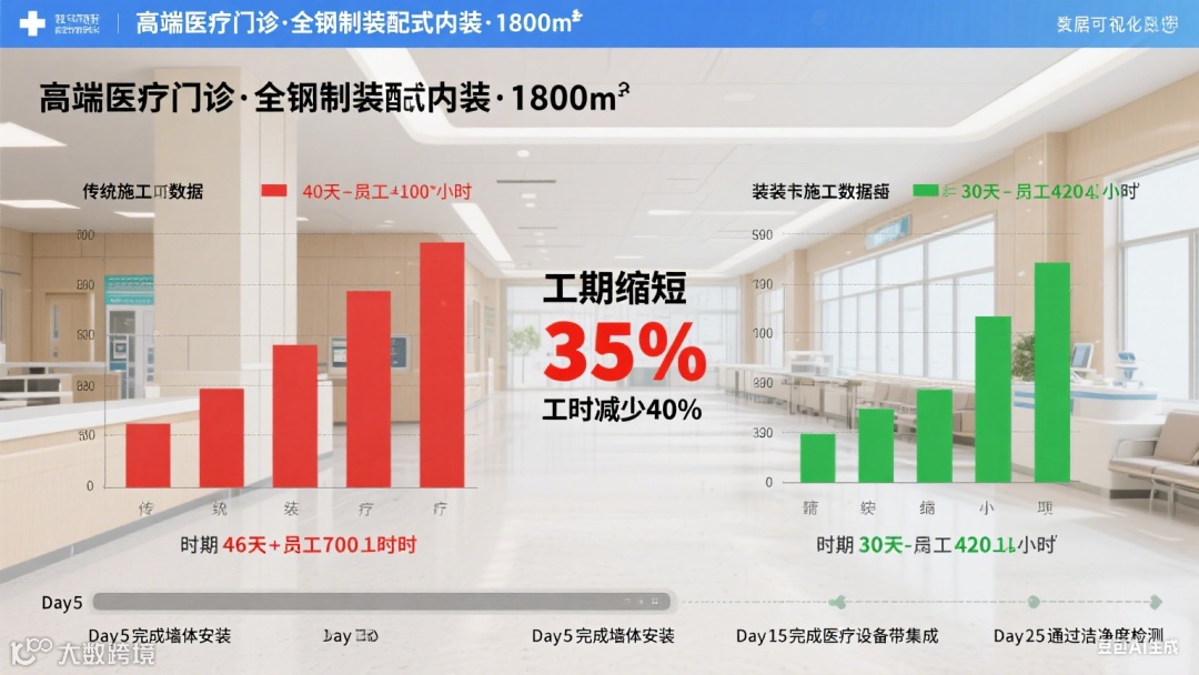 国内某高端医疗门诊项目,全面采用全钢制装配式内装系统,总面积1800平方米,从开工到交付仅用时30天,总用工工时420个,相比传统工期缩短了35%。这不仅证明了该模式在高端、洁净空间领域的适用性,其高效、可控的特性更是连锁商业梦寐以求的。