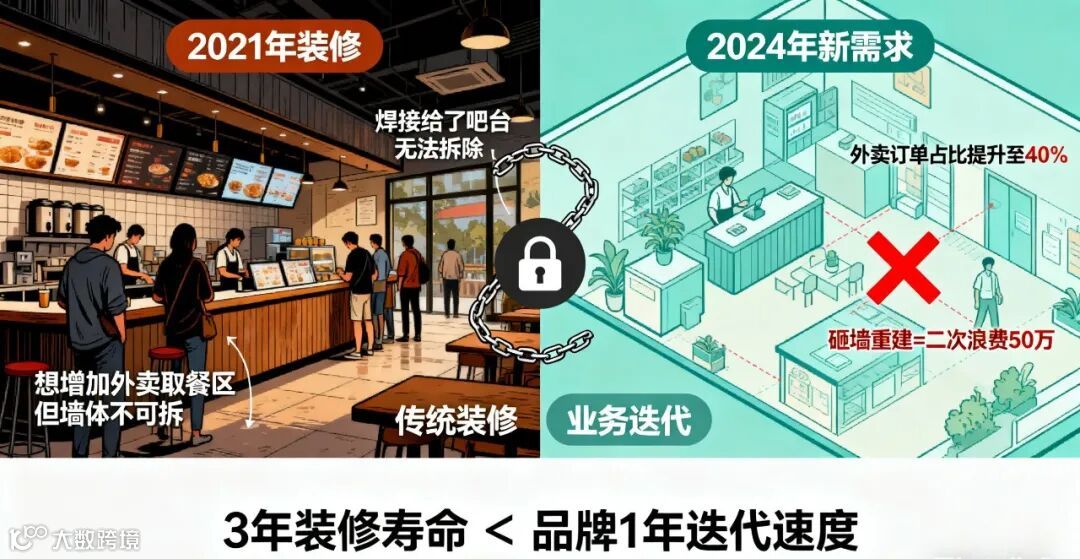 灵活性差,难以适配业务:商业形态快速迭代,但传统装修“一次定终身”,空间布局极难调整。当品牌需要升级形象或调整功能时,往往只能“砸掉重来”,造成巨大的二次浪费。