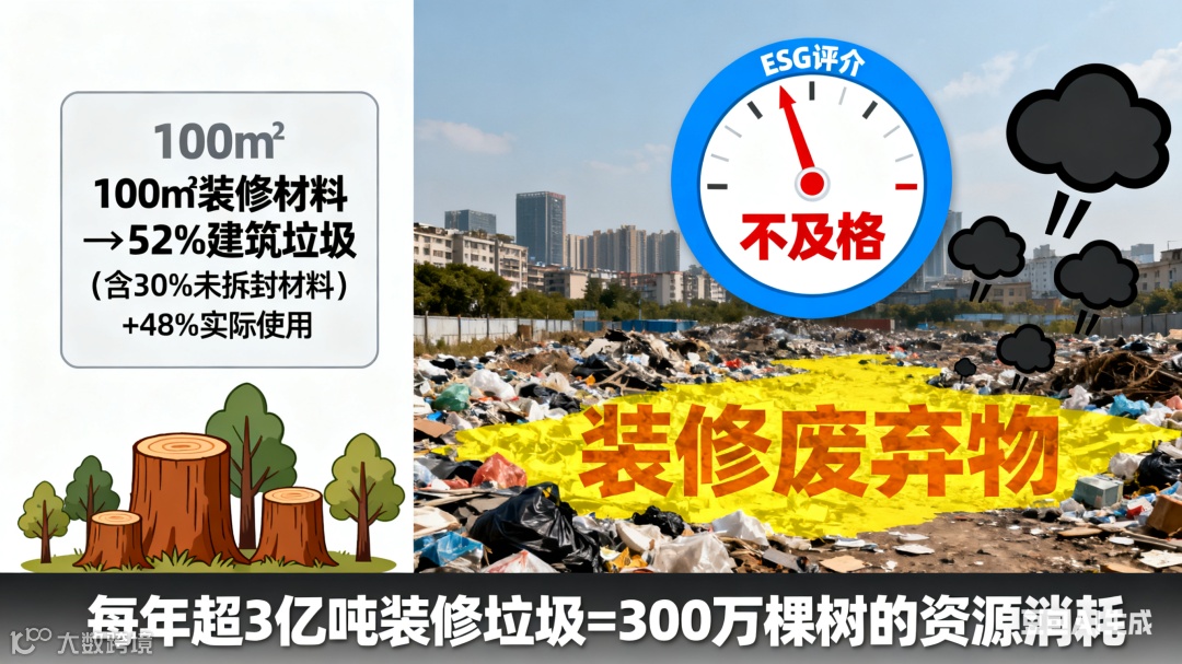 浪费严重,背离ESG理念:传统装修材料综合利用率不足50%,产生的建筑垃圾占城市垃圾总量的30%-40%,不仅造成资源浪费,也与现代企业追求的可持续发展目标相悖。