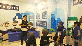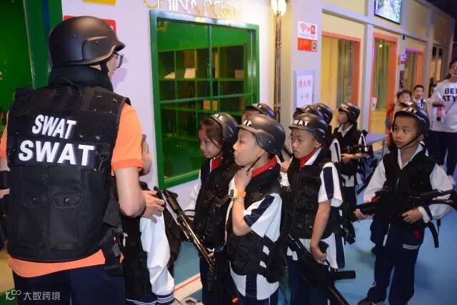 学习押钞员相关知识,全副武装,穿防弹衣、防弹头盔、枪械,执行押钞任务,培养孩子社会责任感。