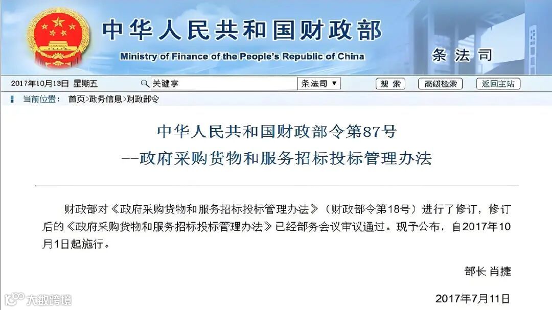 根据《政府采购货物和服务招标投标管理办法》(财政部令第87号):