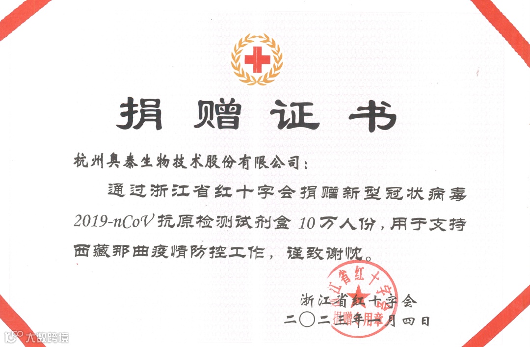 在捐赠仪式上,奥泰生物通过浙江省红十字会向浙江省援藏指挥部捐赠了10万人份抗原检测试剂盒,省红十字会向董事长高飞递交了捐赠证书和功德牌。