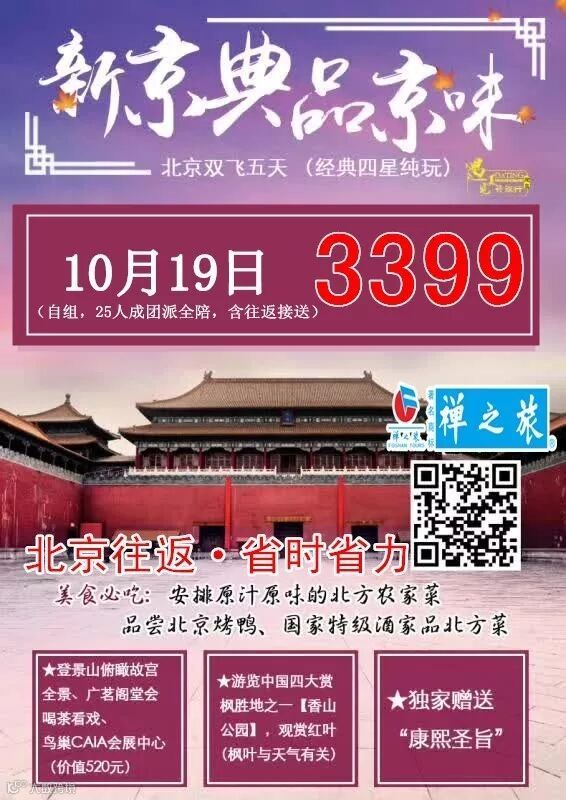 (温馨提醒:除10月9、10、11、17、18、19、24、30日期是固定北京往返,其他日期有可能港口有一程天津,具体航班以出票为准,我社将根据具体时间和进出港口调整行程,以我社计调最后出团通知书行程确认为准;我社有权根据具体航班调整景点游览的先后顺序,如一程飞天津赠送天津市区半天游览,保证不减少景点和游览时间。)