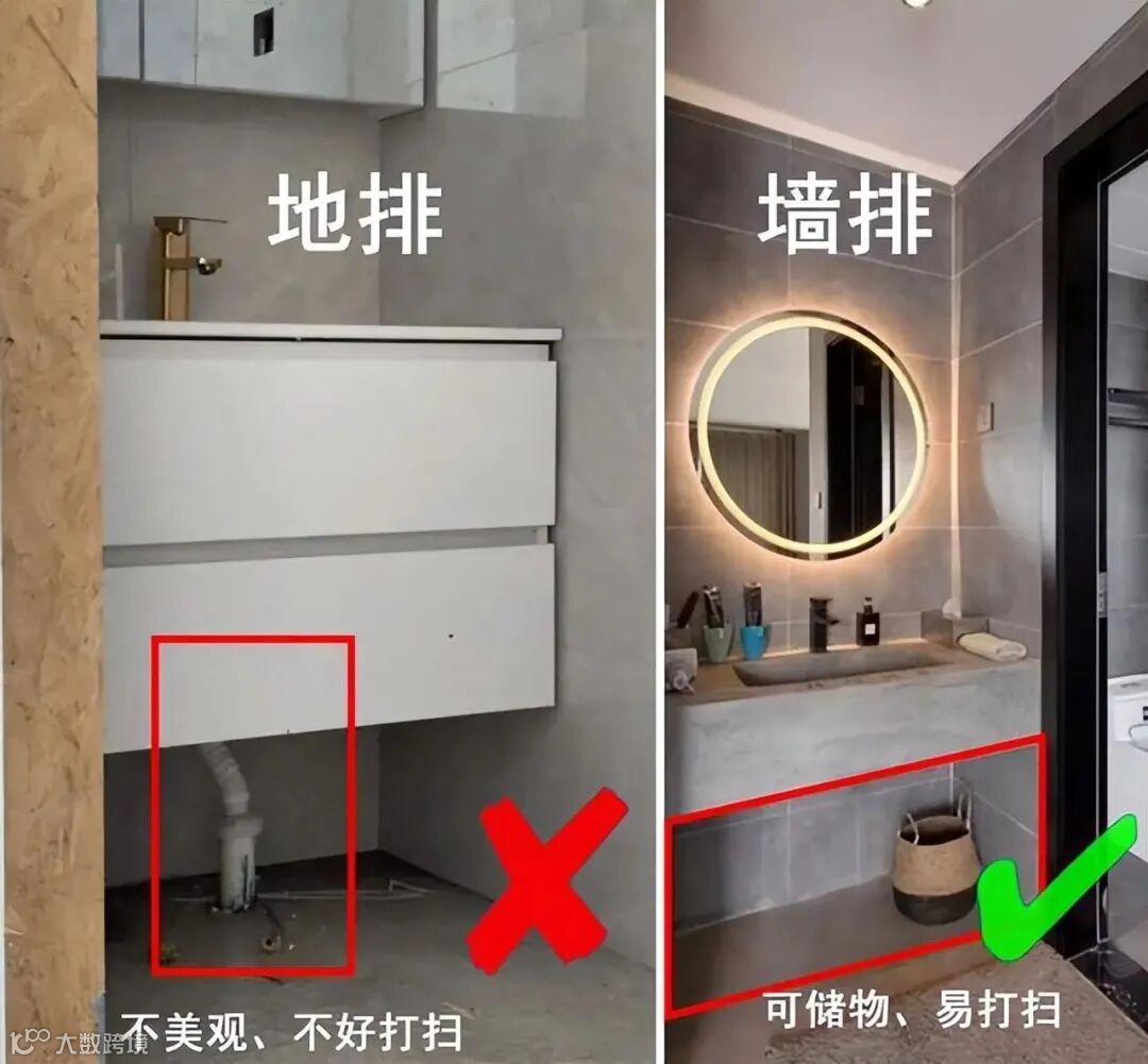尽管墙排浴室柜再颜值上比较加分,排水管啥的都隐藏起来了,也方便打扫,但是有一说一,一旦后期产生问题,比如洗手盆下水管堵塞之类的,检修难度还是比较大的,甚至有可能还需要敲开瓷砖去做疏通,毕竟管子埋在墙里,如此一来不仅麻烦,维修费也高。。