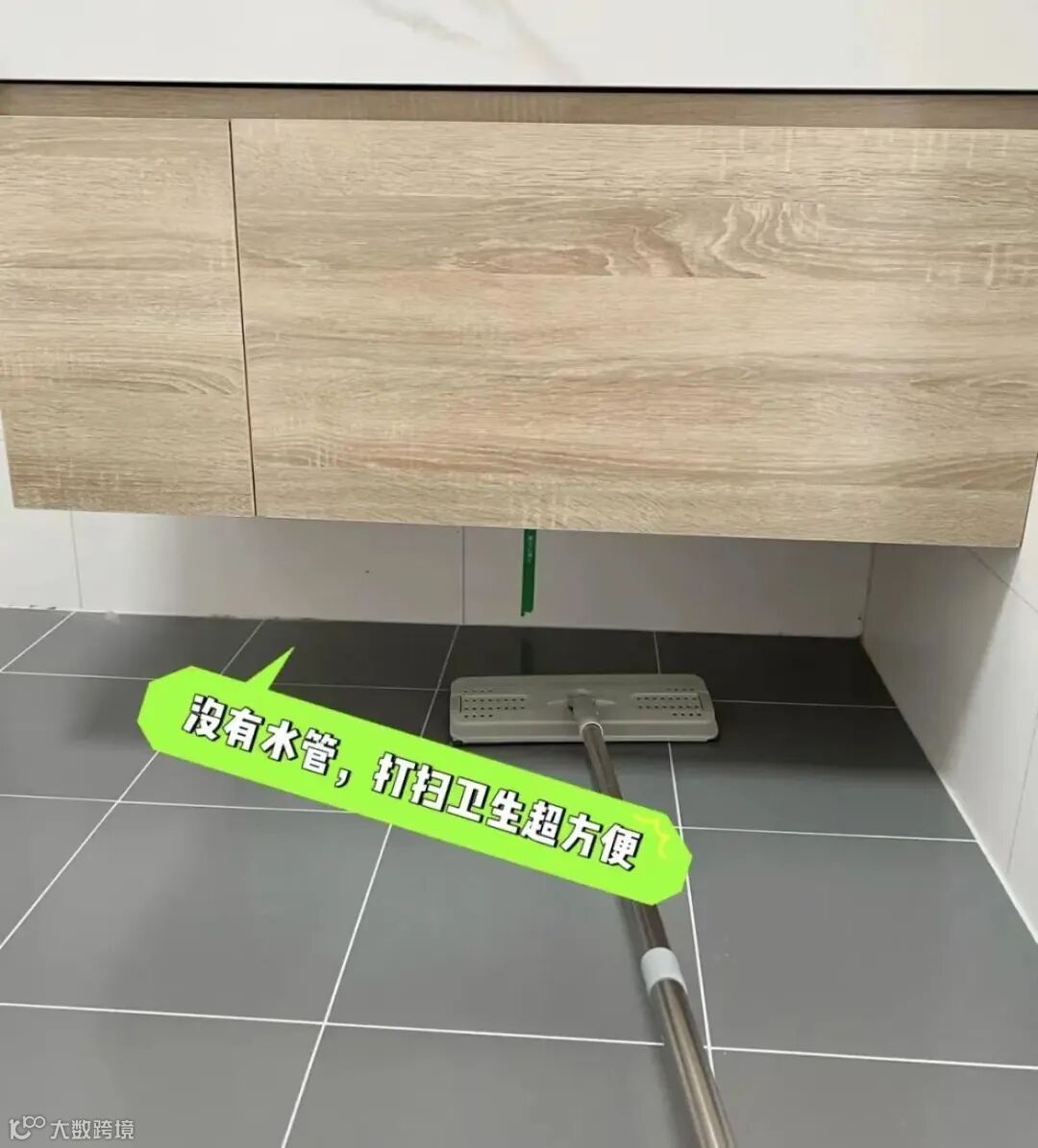 也正因为没有了下方的排水口和排水管道,墙排浴室柜更便于清洁,拖地的时候拖把直接伸进去就能清洁干净,不用避开弯弯绕绕的障碍物,也没有卫生死角,方方面面都能清洁到位。。