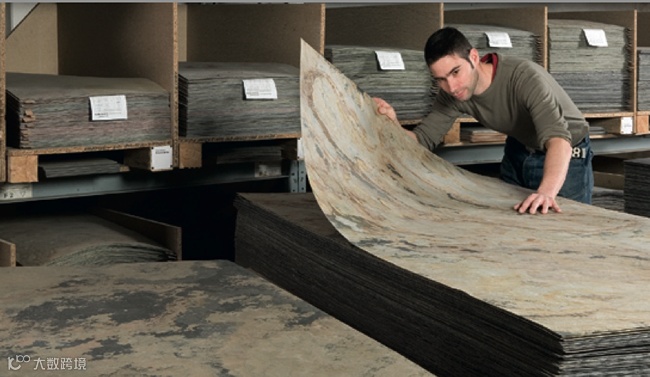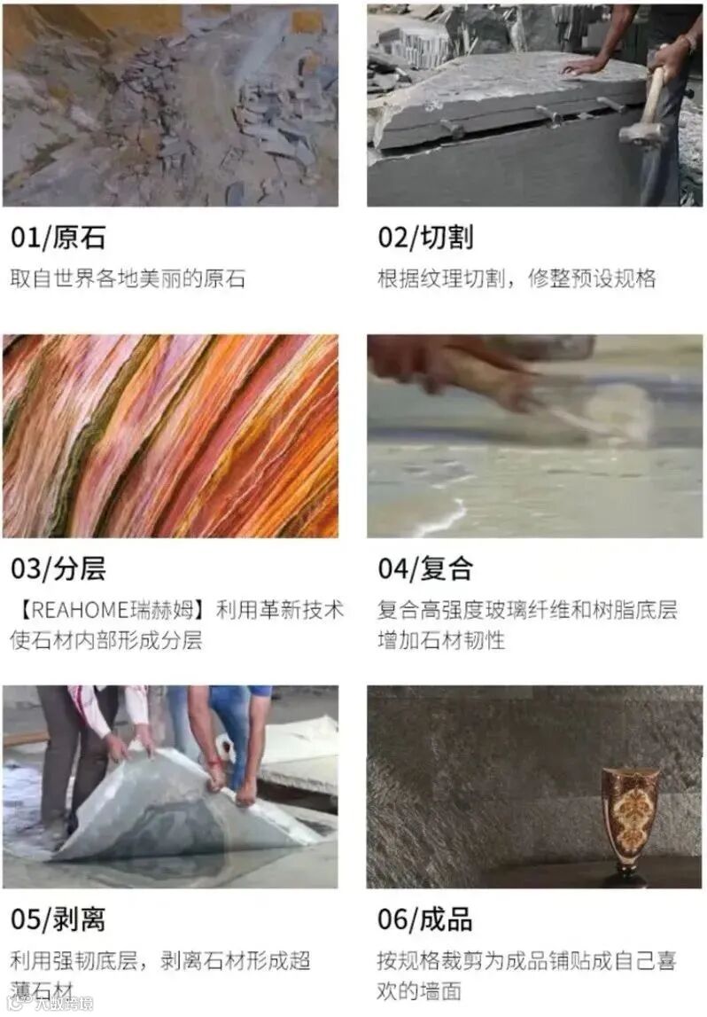 超薄石材的加工流程其实需要很多步,从采取世界各地的原石开始算起,再根据纹理进行切割,修整预设规格;利用革新技术使石材内部形成分层;然后使用复合高强度玻璃纤维和树脂底层增强石材韧性;最后通过强韧底层,剥离石材形成超薄石材。