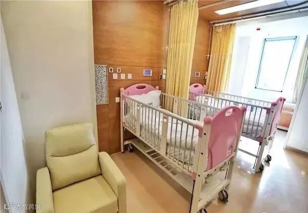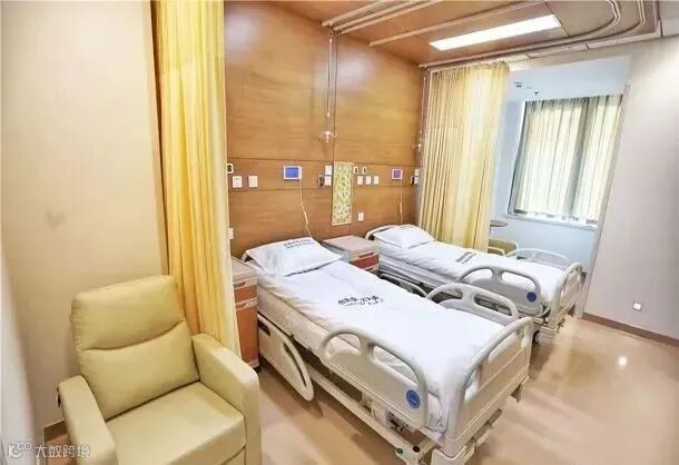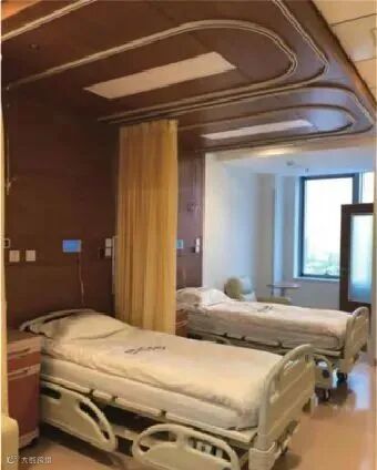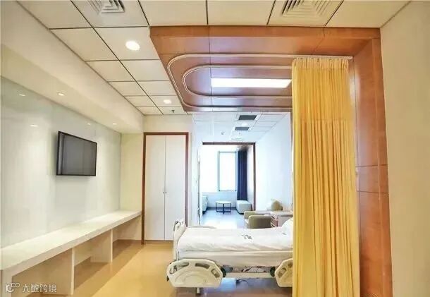 床头背景木饰面造型结合病床布置设计尺寸为3600mm×2700mm,在离地1400mm高处设置医疗设备带,医疗气体的空气终端、负压终端、氧气终端、呼叫对讲、强弱电插座等都整齐有序地布置在气体设备带上。