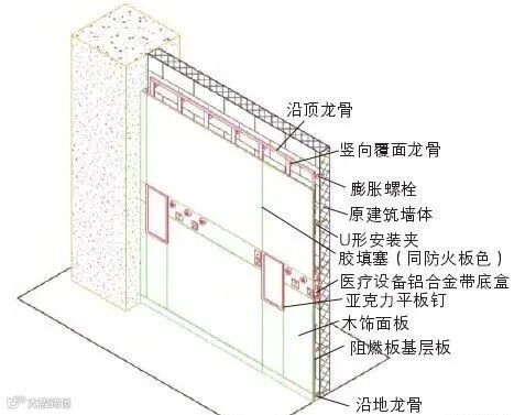 根据现场实际情况提前进行实地测量,按照测量数据进行U形固定夹、敷面龙骨、阻燃板提料,医疗设备带定制、面层防火板定制下料。