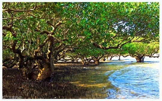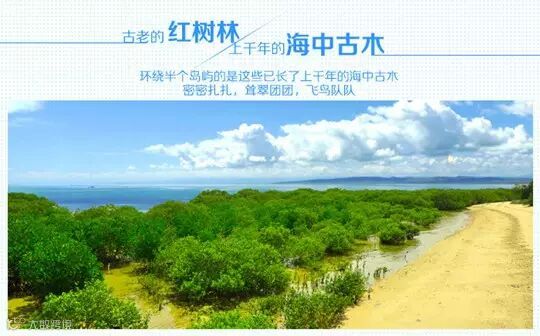 蓝得发绿的海洋、白得发亮的沙滩和层层喷绿的千年红树林,横跨红树林延伸到海中心的海上栈桥,走在上面感觉浪漫唯美,全然是一副马尔代夫度假的醉人画面。