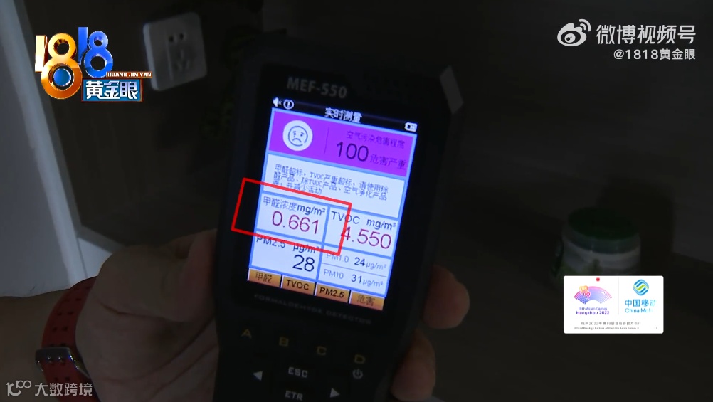 赖女士用空气检测仪在两个房间分别检测,在放进客厅的鞋柜之前,这台空气检测仪的甲醛浓度数值是每立方米0.144毫克左右。放进鞋柜几分钟之后,空气检测仪上显示的甲醛浓度是每立方米0.661毫克。