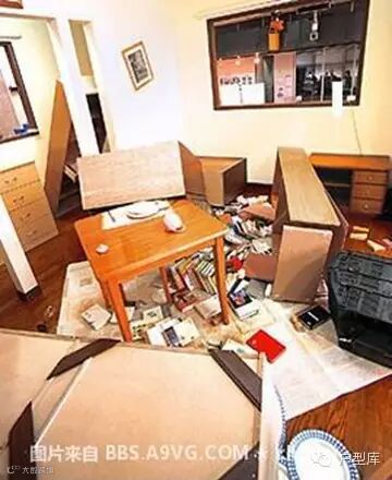 1、未安装免震系统的普通木结构住宅,摇晃剧烈,家具倾斜,碗碟损坏