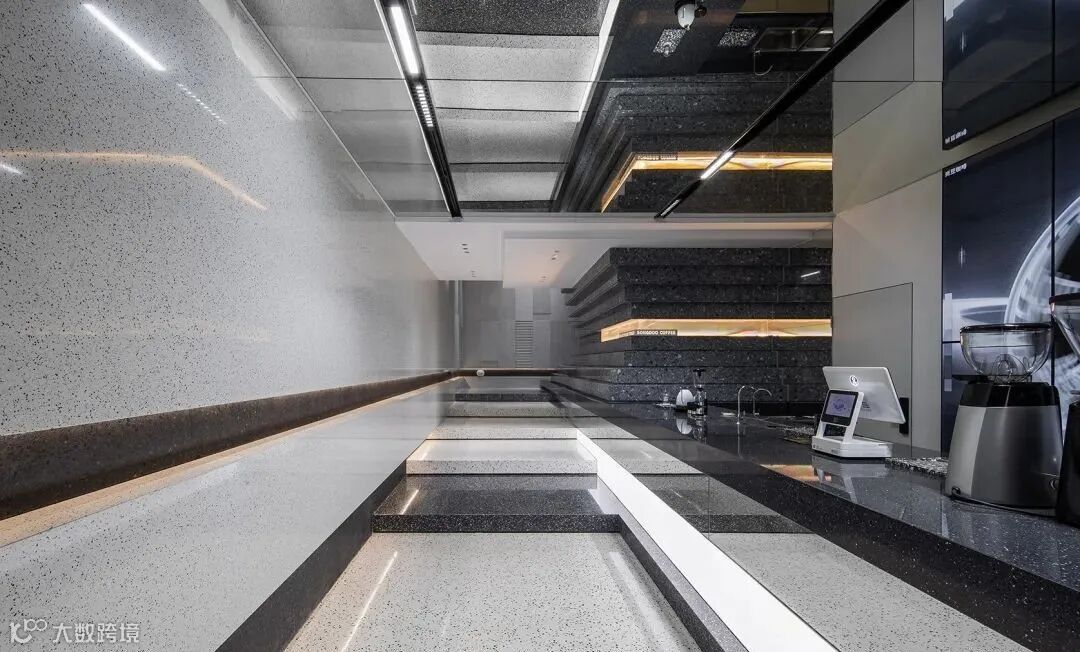 预制水磨石是通过在工厂经过现代化设备加工而成,经过布料、震动、高压、养护、切割等工序,可控性较高,成品为单片板材,运输方便,施工成熟,适合各种空间应用。