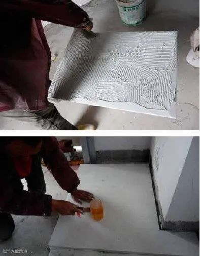 薄底法施工方法与半干湿法在找平层以后的工艺大同小异。由于薄底法基层已经固化成熟, 湿度较低,因而可以避免大部分因地下水汽及找平层湿度高引发的人造石后期使用中的质量 问题,且施工简单方便,安全性更高。