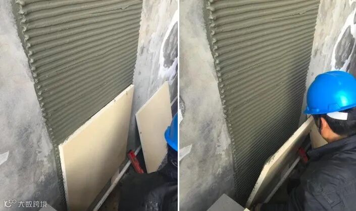 采用 10mm*10mm 齿形镘刀直边,将粘结 剂在基层上平整地涂抹一层,再用镘刀锯齿 边将胶粘剂梳理出饱满无间断的锯齿状条 纹,厚度约为 6~8mm。