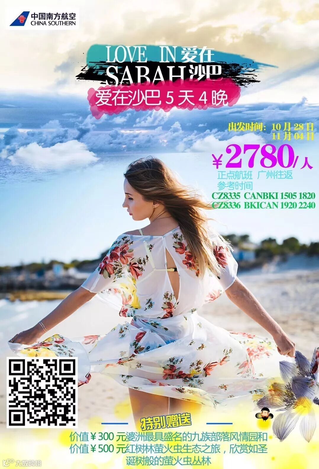 【中国南方航空】10月28日、11月4日出发:爱在沙巴5天4晚(广州往返)┃2780元!