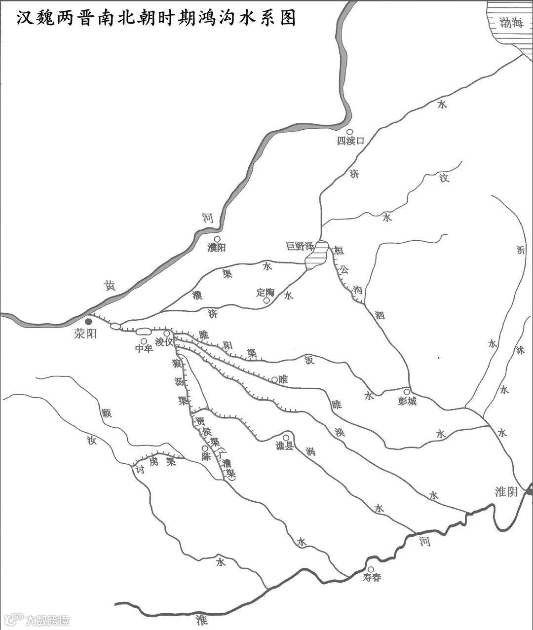 4、鸿沟(狼汤渠)魏惠三十一年(前361)引圃田泽水东流至大梁城北,然后绕过城东,折而南流,利用沙水河道南流经陈(今河南淮阳)东,在今沈丘县北注入颍水。从大梁至颍水一段,战国时称鸿沟,西汉时又名狼汤渠。