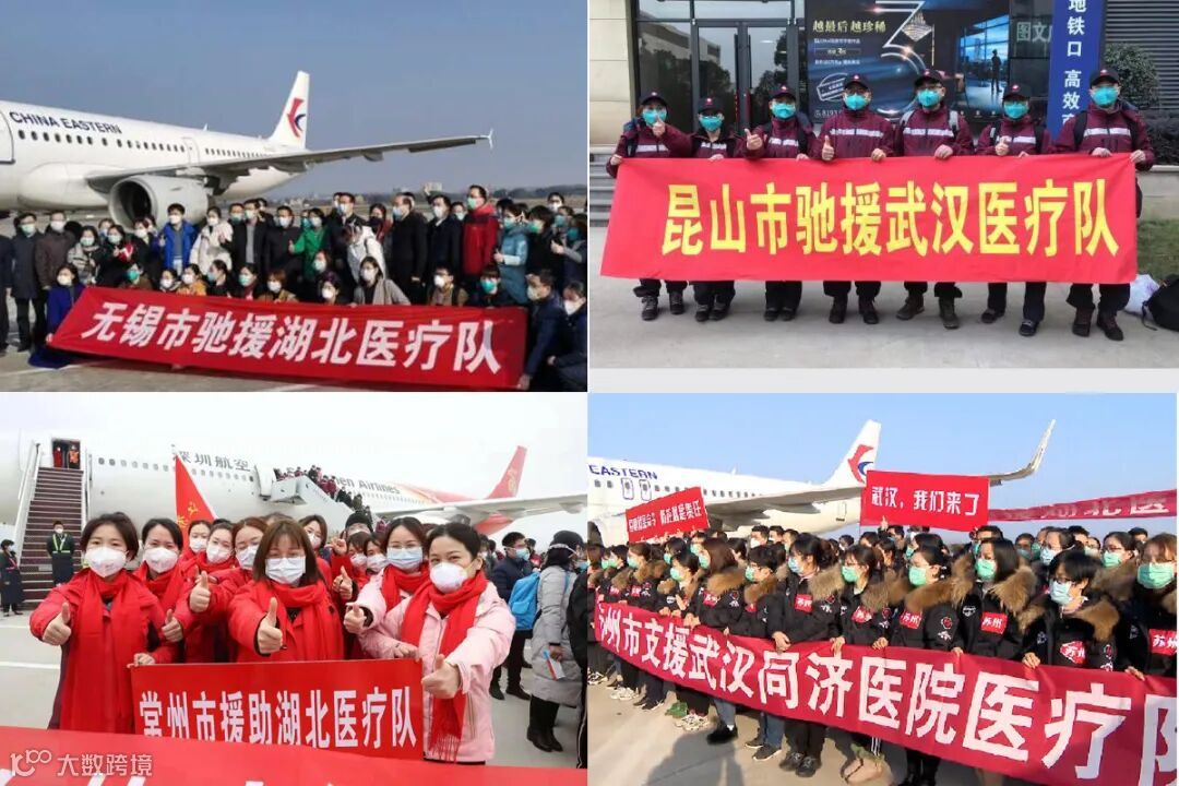 而江苏却有不一样的操作方式:苏州市驰援湖北医疗队、无锡市驰援湖北医疗队、徐州市赴湖北应急医疗队、启东市支援湖北医疗队、丰县驰援湖北医疗队……