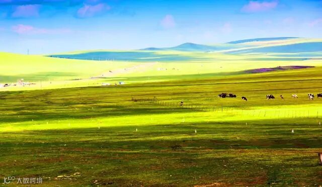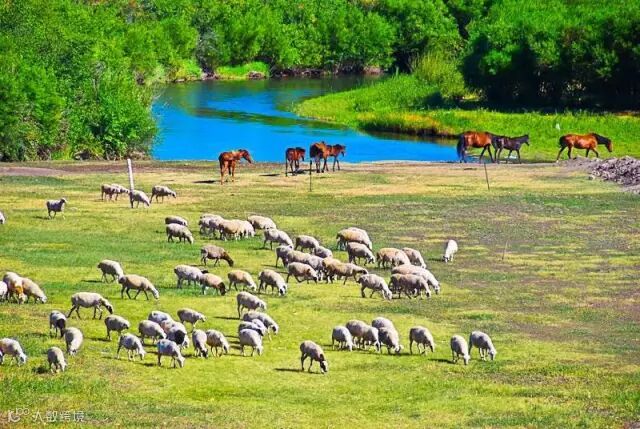 一望无际的草原点缀着群群牛羊,有牧草王国之称。一路草原风光,草原上的牛羊自是不必说了,哪怕汽车在公路上行驶,常常也要停下来给牛羊群让路呢!