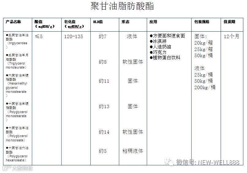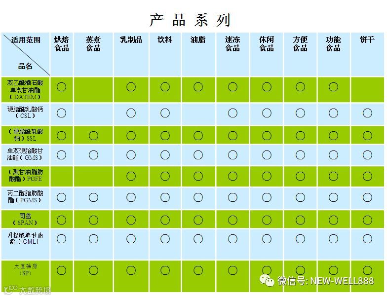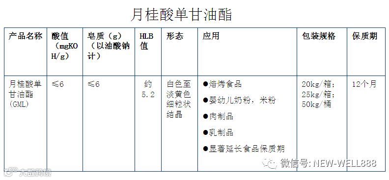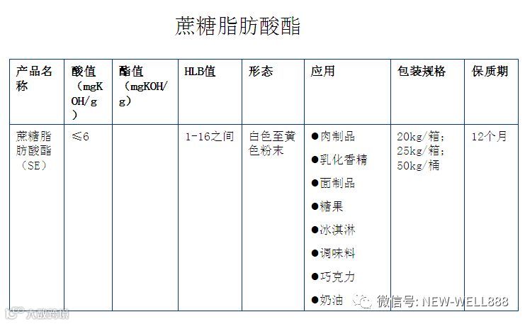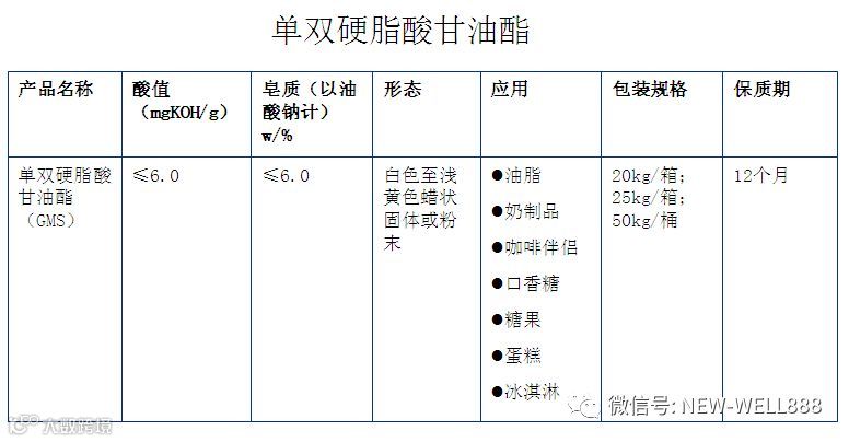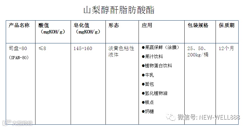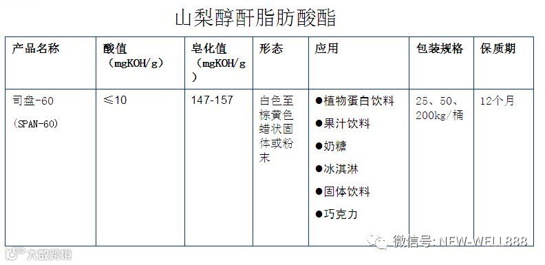 •乳化剂-NWB 在食品中起乳化作用,也具有起泡,悬浮,破乳,消泡,络合,结晶,湿润,润滑的功能
