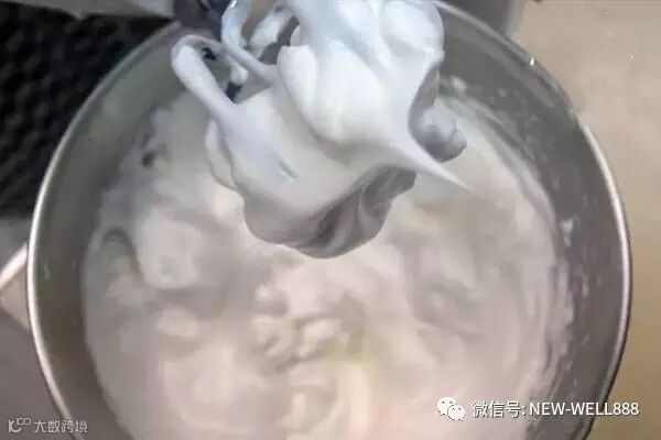 ③打蛋白的时候要注意容器和打蛋器都不能有一点水,蛋白中也不能掺入一点蛋黄,打的途中加点砂糖、白醋或者鲜柠檬汁,成功的蛋白标准是用打蛋器挑起蛋白后被挑起的部分不下垂,像个小雪山似的立着↓↓↓