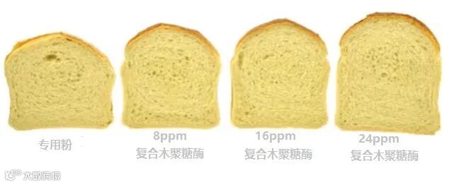 1.复合木聚糖酶能降低专用粉制作全麦面包的老化率和硬度,使全麦面包表面更加光滑,内部孔径更加均匀,面包更加柔软。