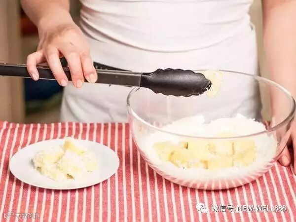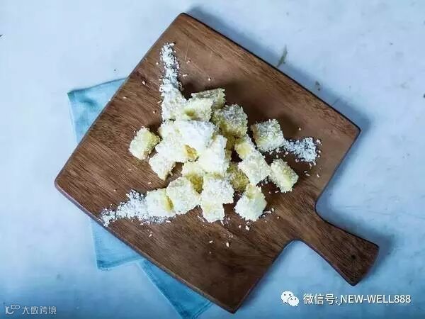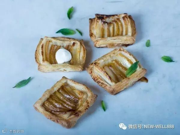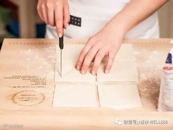 ①将烤箱预热至180摄氏度。用一把锋利的刀将已解冻的酥皮切分成6厘米见方的方块。