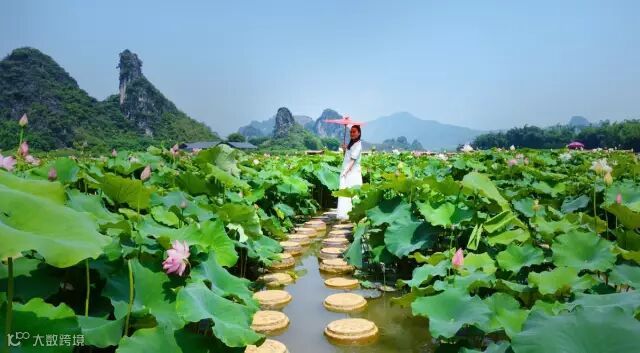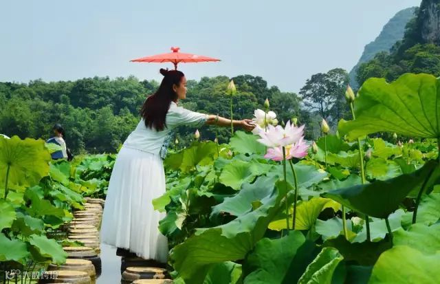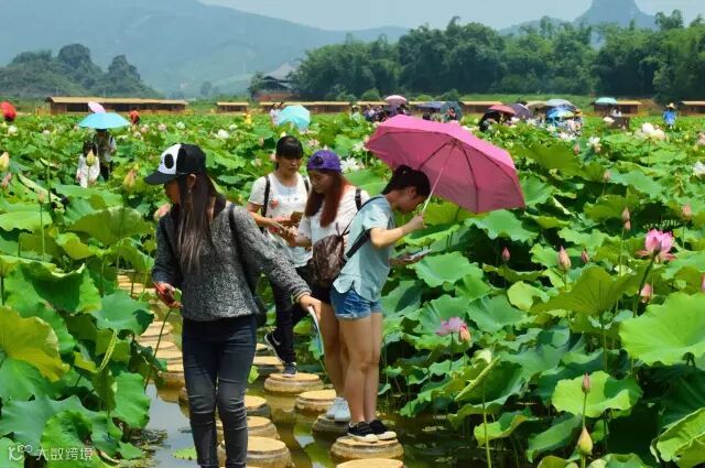 峰林莲湖特别设计的“亲水栈道”让游客与荷花亲密无间。