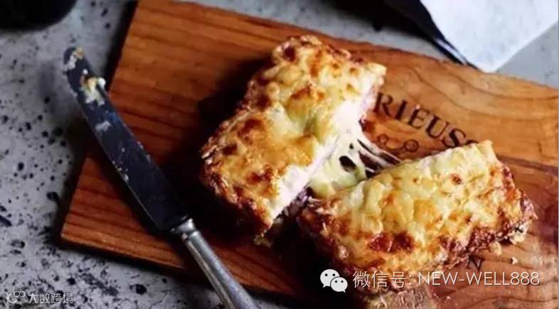 如果你很爱芝士,那么法国人发明的这道Croque Monsieur你一定不能错过。方包内夹着火腿和芝士,外层还有芝士包裹,在黄油中煎得焦香,超级高的卡路里,但绝对可以让芝士狂热粉大呼满足。地道的Croque Monsieur一般会用Emmental或Gruyère这两种芝士。