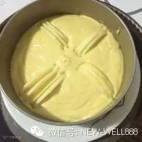 8. 面糊倒入模具中,稍微震几下消去气泡,用刮刀刮平表面