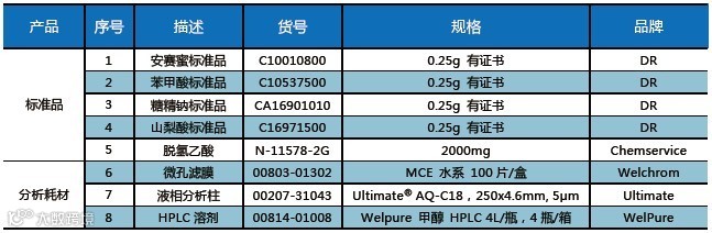 适用于食品中安赛蜜、苯甲酸、山梨酸、糖精钠、脱氢乙酸的检测。