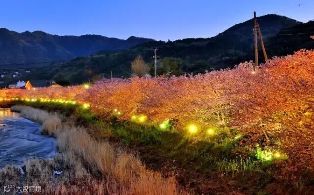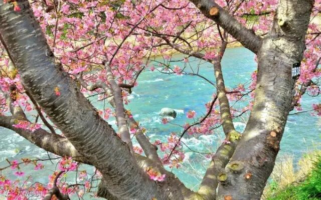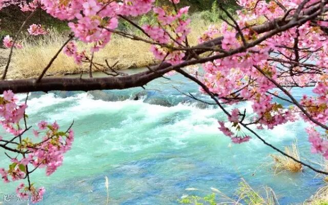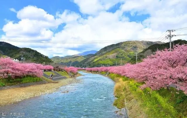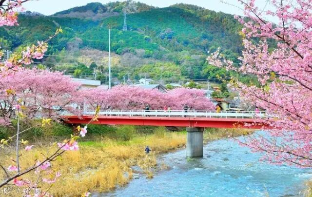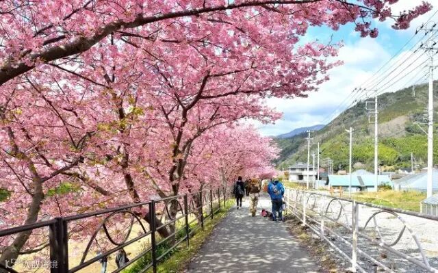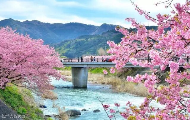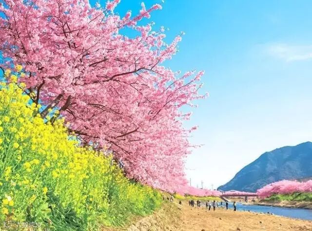 同时也是日本最早盛开的樱花,走在粉红色的河畔樱花隧道中,无限的浪漫,与同时期的嫩黄油菜花,一同带来一场热闹的樱花祭典。