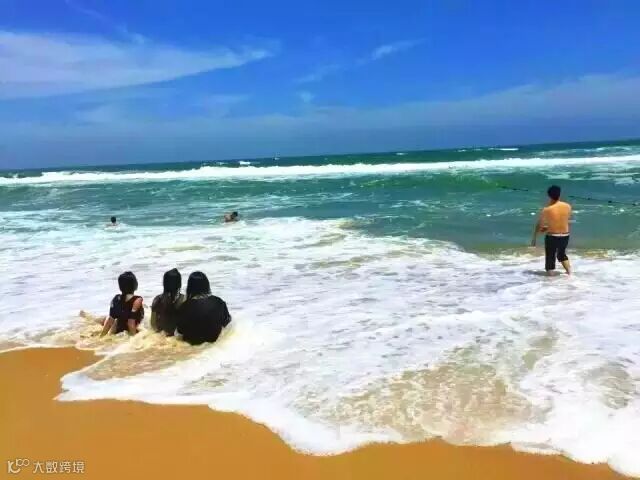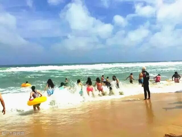 海浪汹涌澎湃,掀起的浪花有一米多高,手拉手,扎稳马步,等待海浪的冲击,却又怕被卷进海浪当中,真是又爱又恨。