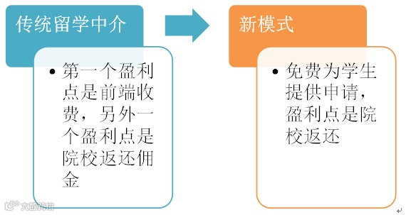 留学服务行业现有的商业模式一是收取中国学生的服务费用,二是收取国外院校返还的学费佣金。实行‘零中介’留学后,相当于留学机构的第一部分费用没有了,这样一来它们主要的收费来源就是靠国外院校返还的佣金。对于这些机构而言,收取国外院校佣金便成为其主要的商业模式,互联网留学模式节省了大量的人力成本、地面租金,抵消了传统留学中介收取的服务费用。