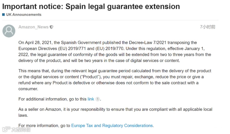 1月12日消息,亚马逊欧洲站发布公告称,西班牙政府发布新法令要求将产品的保证期从两年延长至三年,以下为公告内容: