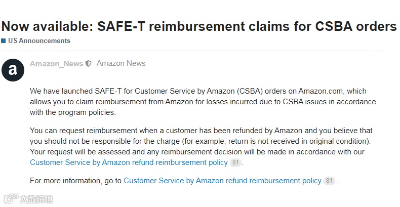 1月8日消息,亚马逊更新了SAFE-T for Customer Service by Amazon (CSBA)政策,让卖家可以根据计划政策向亚马逊索赔因 CSBA 问题造成的损失。