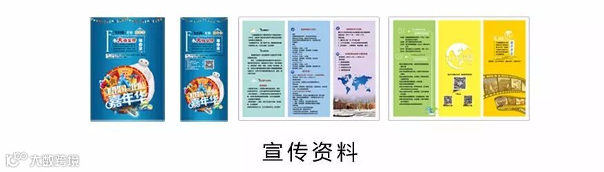 印有飞出国二维码的“嘉年华”X展架,交由学生派发的飞出国宣传单页,以及飞出国合作商家的项目三折页。