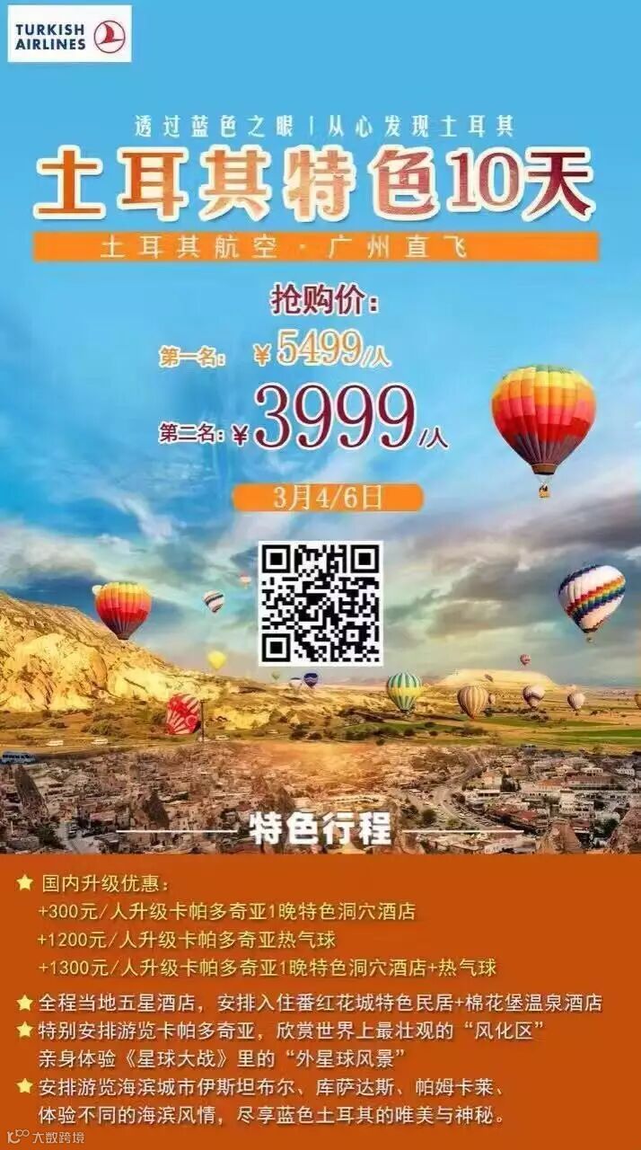 +1200元/人升级卡帕多奇亚热气球(境外报名250美金/人)。