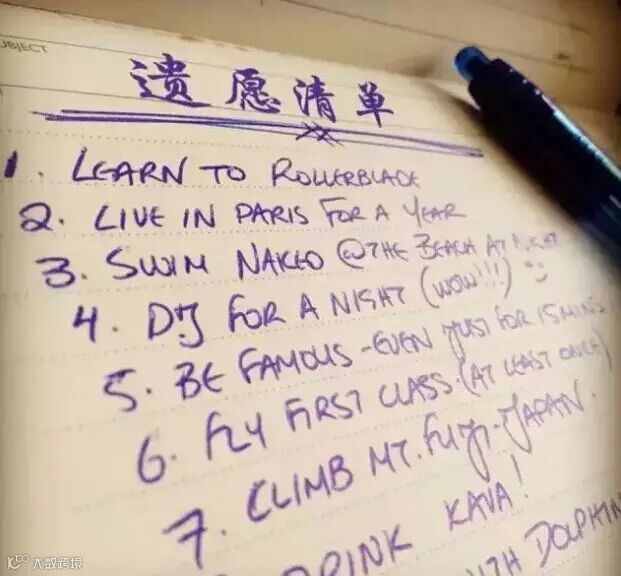 请你看看你刚刚写的如果不做,会成为你死前最后悔的事情,然后写下你的遗愿清单。给自己起码一个上午或者下午的时间,在安静不被打扰的地方,写下你死前最想做的100件事情并且由近到远,为它们的实现定一个期限。