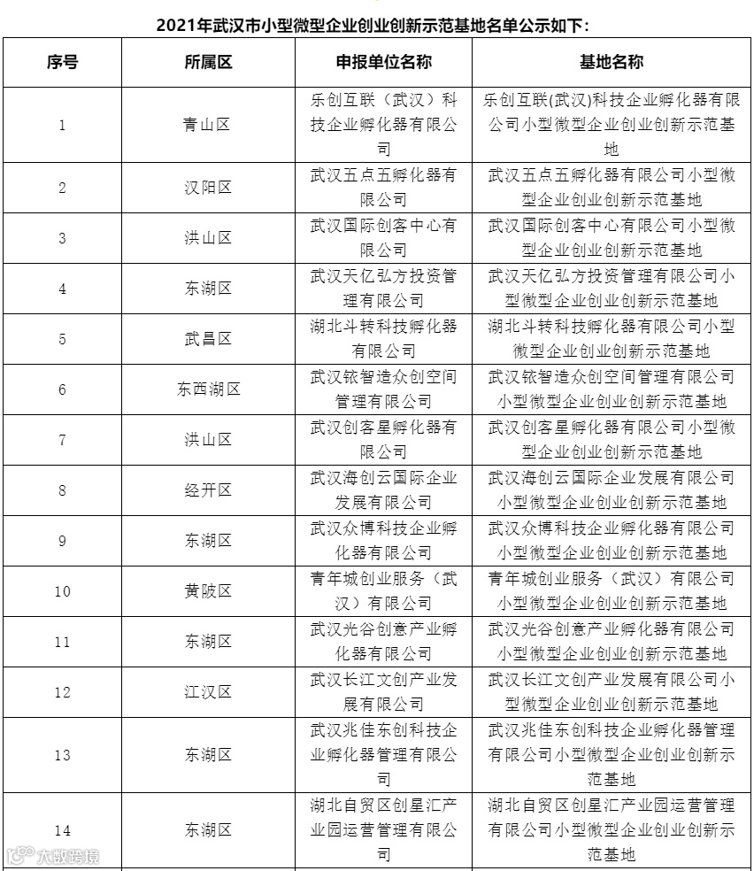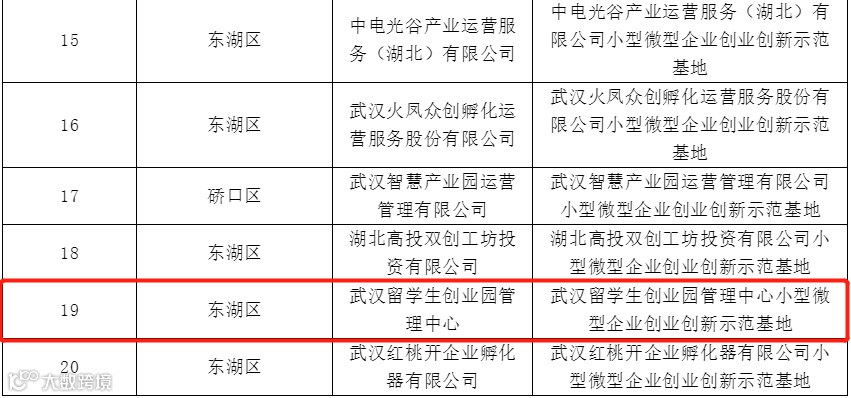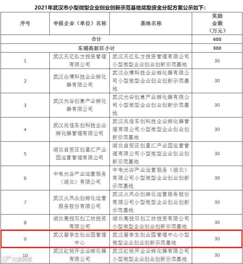 10月29日,武汉市经信局公示了2021年武汉市小型微型企业创业创新示范基地认定及奖励资金分配方案。武汉留学生创业园管理中心入选2021年武汉市小型微型企业创业创新示范基地。