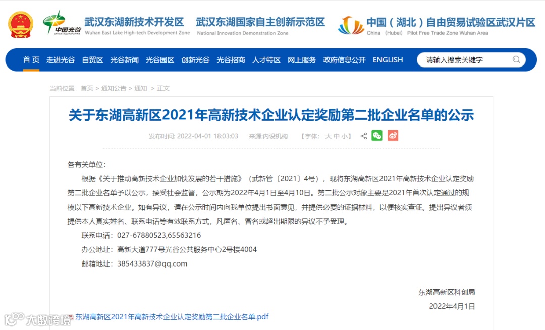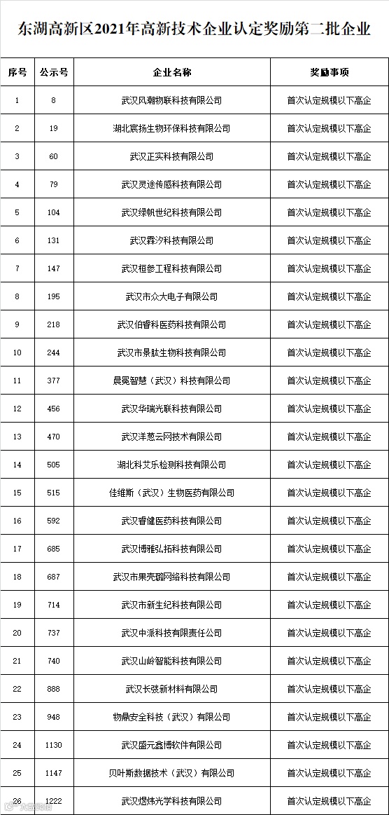 近日,东湖高新区科创局公示了东湖高新区2021年高新技术企业认定奖励第二批企业名单。此次公示对象主要是2021年首次认定通过的规模以下高新技术企业。