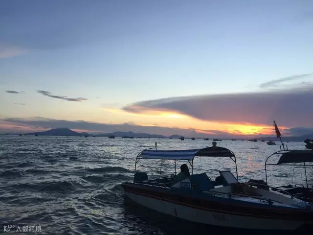 晚霞光散落在海面上,波光粼粼,零星的船只在不远处被海浪来回翻打着.....美像一幅油画般绚丽。