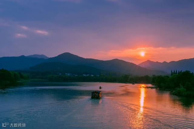 夕阳下的,倒映着太阳的余晖,一艘小船形式其中,荡起淡淡涟漪。