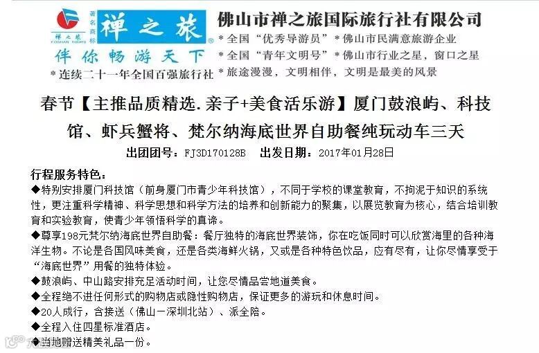 厦门鼓浪屿、科技馆、虾兵蟹将、梵尔纳海底世界自助餐纯玩动车三天