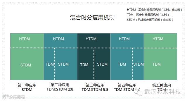 该芯片实现同时兼容多协议、满足IP互联网、工业互联网以及物联网IOT的需求,适用于任何无线系统应用,尤其可解决泛在网不同构架与协议兼容和融合难题。国际首创发明混合时分复用机制(HTDM,Hybrid Time Division Multiplexing),兼容TDM与STDM两种通信机制,且由后台对数据进行处理后按比例分配TDM和STDM时间。通过控制每个周期T内TDM与STDM的时间比例,可以总结为以下五种应用: