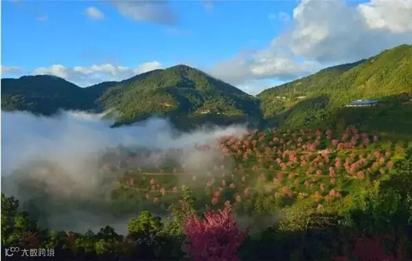 大理南涧无量山樱花谷,位于大理州南涧县无量山镇,距离南涧县城51公里。樱花种植于千亩茶园之中,作为覆荫树,据不完全统计有上万株。每年11月底至12月初,全国大部分地区天寒地冻,而美丽的云南大理南涧县的无量山却春意盎然,樱花谷的冬樱花开放,繁樱绚丽,山谷如画。由于这里地处红河流域,纬度相对偏南,充足的水汽遇上阳光,就造就了晨雾,这一现象在冬季尤其明显,所以樱花盛开的时候,容易遇到清晨云雾缭绕,此景美不胜收,构成一幅迷人仙境。漫步云雾缭绕的千亩茶园,碧波荡漾的翠绿映衬着如霞似火的粉色樱花,仿佛置身于油画中。