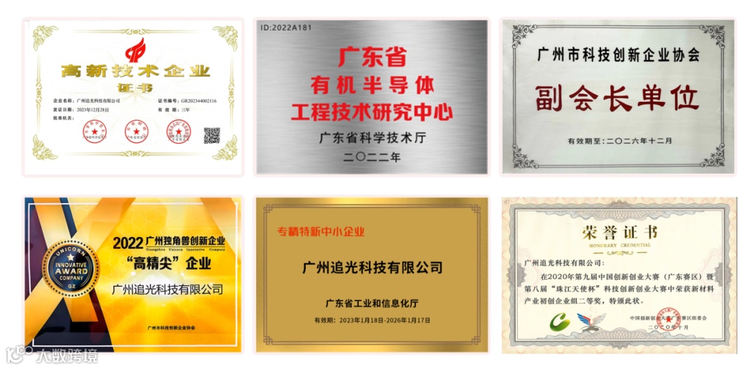 追光科技已完成天使轮、天使+轮、战略轮融资,投资方包括红杉中国、普洛斯、京东方、建智控股、凯得投控。荣誉奖项硕果累累,荣获“国家高新技术企业”、“广东省有机半导体工程技术研究中心”、“广东省专精特新中小企业”、“广州独角兽创新企业高精尖企业”、德勤“中国明日之星”等荣誉称号。