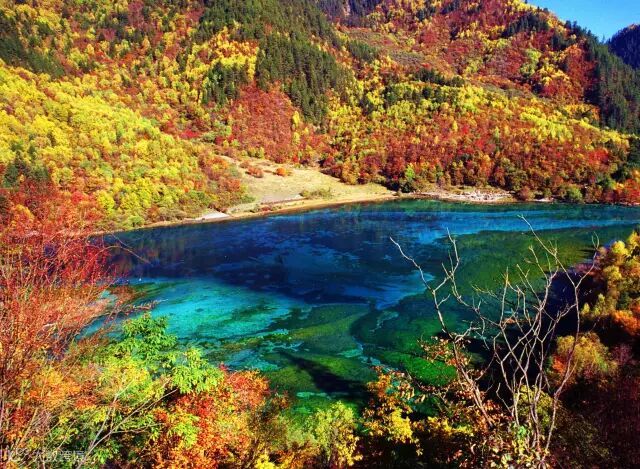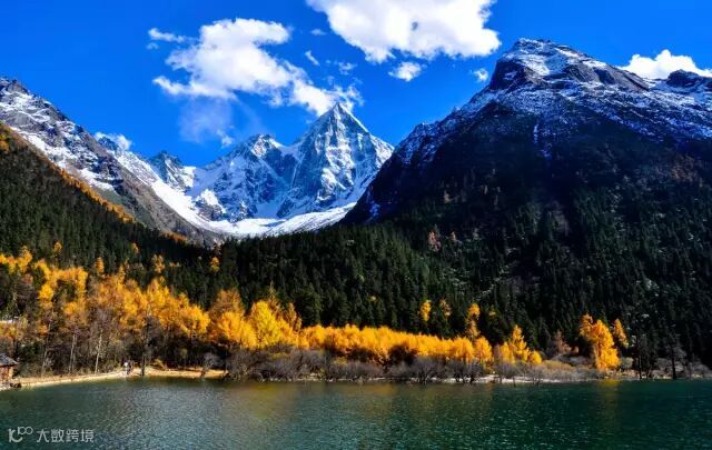毕棚沟是山水的世界,每当深秋季节,这里就办成了一个五彩斑斓的世界,蔚蓝的天空中飘着朵朵白云,映衬着皑皑雪山,碧绿色的湖水,两岸的树黄色的、红色的、绿色的交织在一起,让眼睛的得到了最大限度的满足。