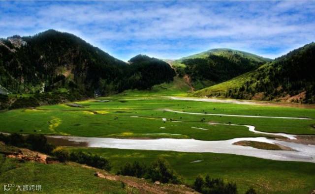 色曲河两岸风光旖旎,绿树成荫,绵延起伏的山脉向四周伸展开来,构成了一幅壮丽的风景画。